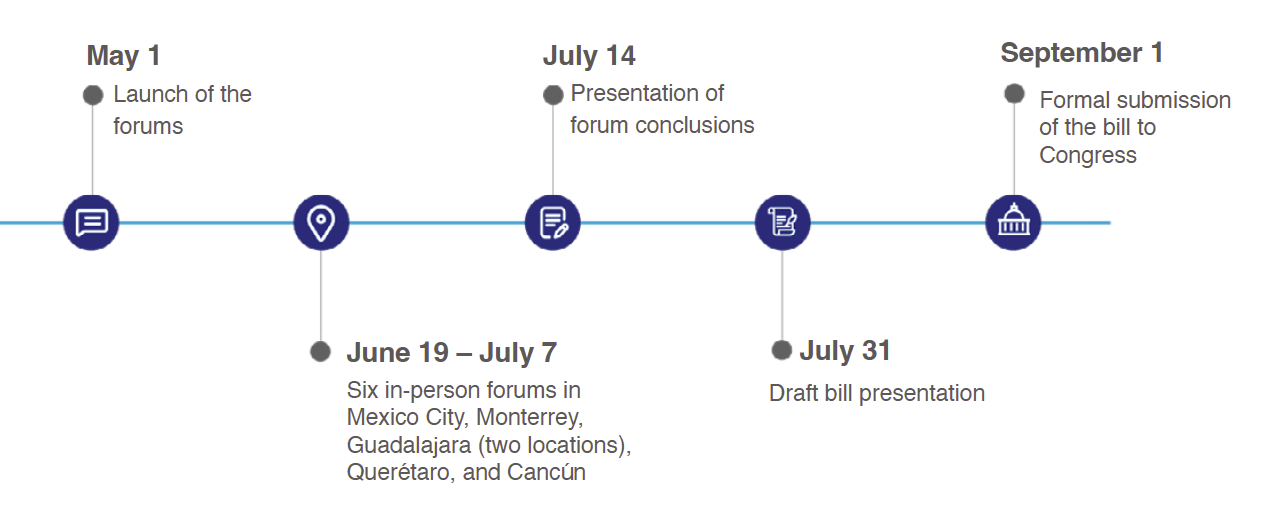 From a legislative standpoint, the reform requires amendments to Article 123 of the Constitution to reduce the maximum workweek and increase weekly rest days from one to two. This initiative was introduced in 2023 and has sparked wide public debate; however, it was not approved during the regular April session. As a result, the STPS, in coordination with the Chamber of Representatives and other stakeholders in different productive sectors, launched the National Tour for the 40-Hour Week—an exercise in social dialogue forming part of the process to draft a formal legislative proposal. This process is expected to unfold as follows: