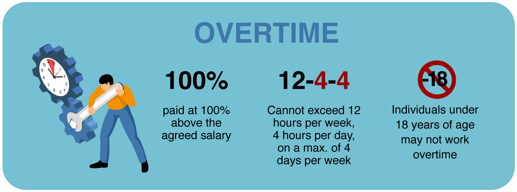 • Overtime must be paid at 100% above the agreed salary for regular hours.